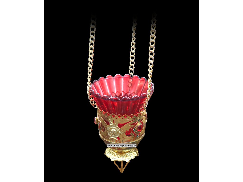 Lampáda dvojfarebná kov a sklo je elegantné osvetľovacie zariadenie kombinujúce pevnosť kovu a jemnosť skla, určené na použitie pri ikonách, oltároch alebo v modlitebných kútoch.