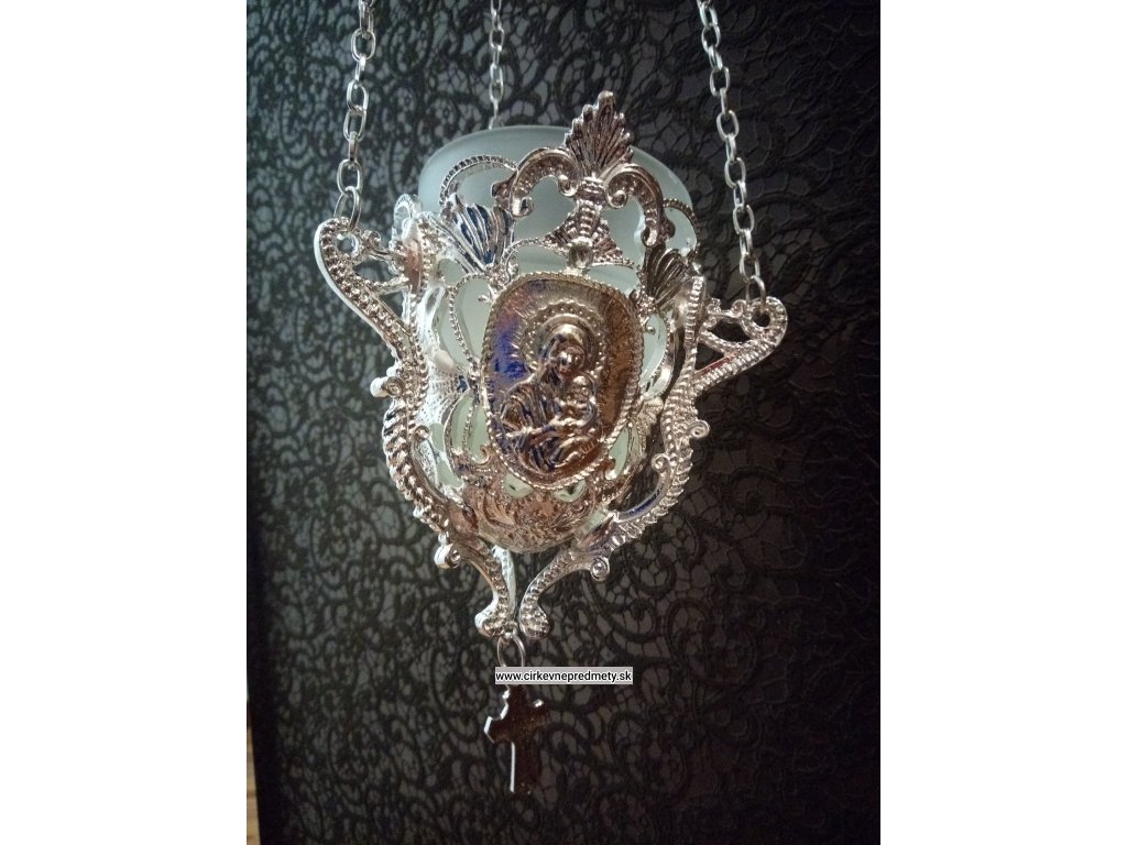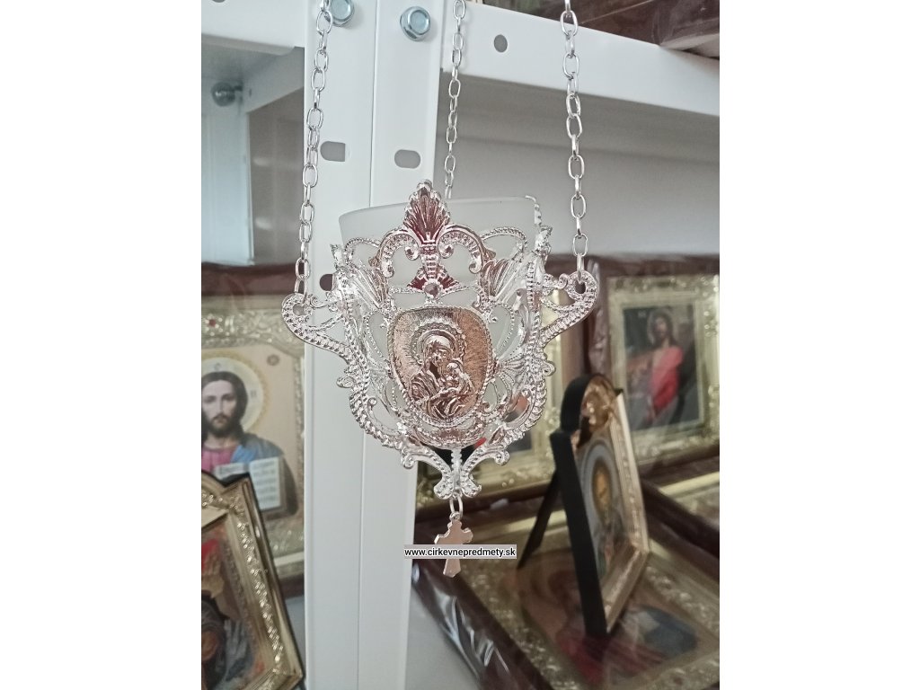 Lampáda dvojfarebná kov a sklo je elegantné osvetľovacie zariadenie kombinujúce pevnosť kovu a jemnosť skla, určené na použitie pri ikonách, oltároch alebo v modlitebných kútoch.
