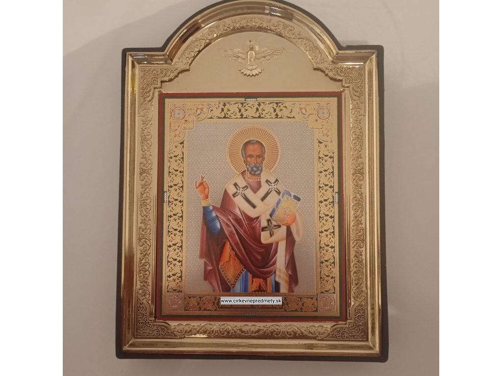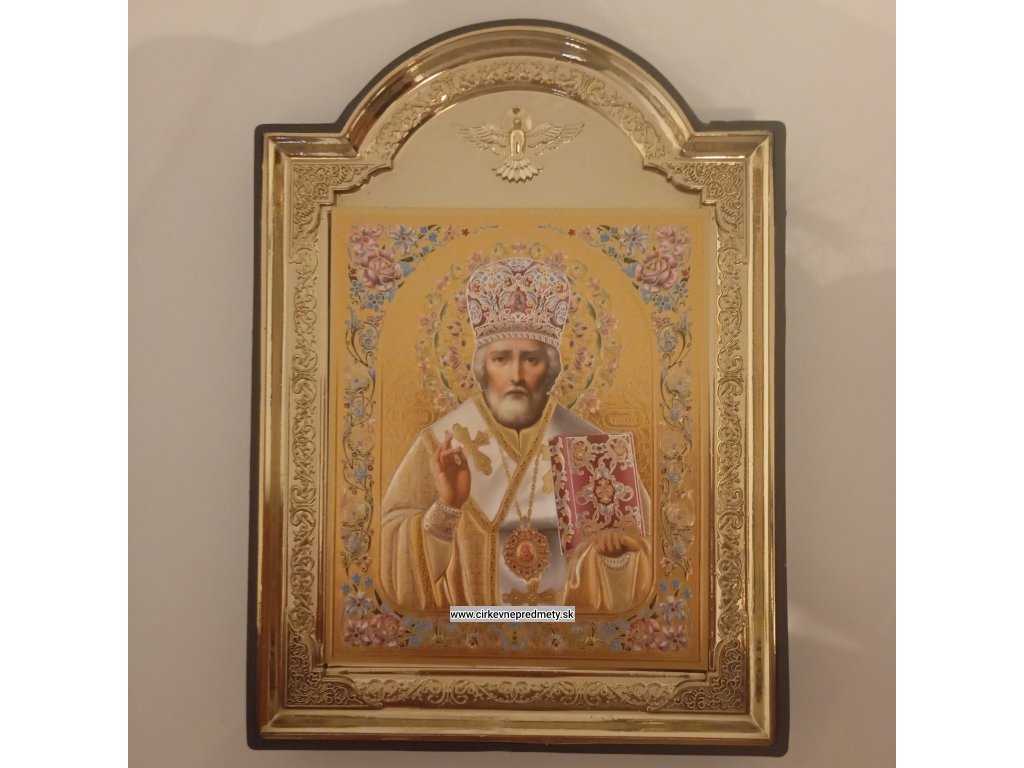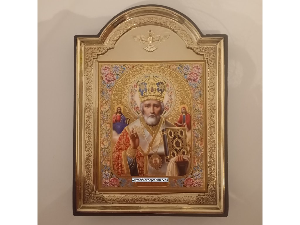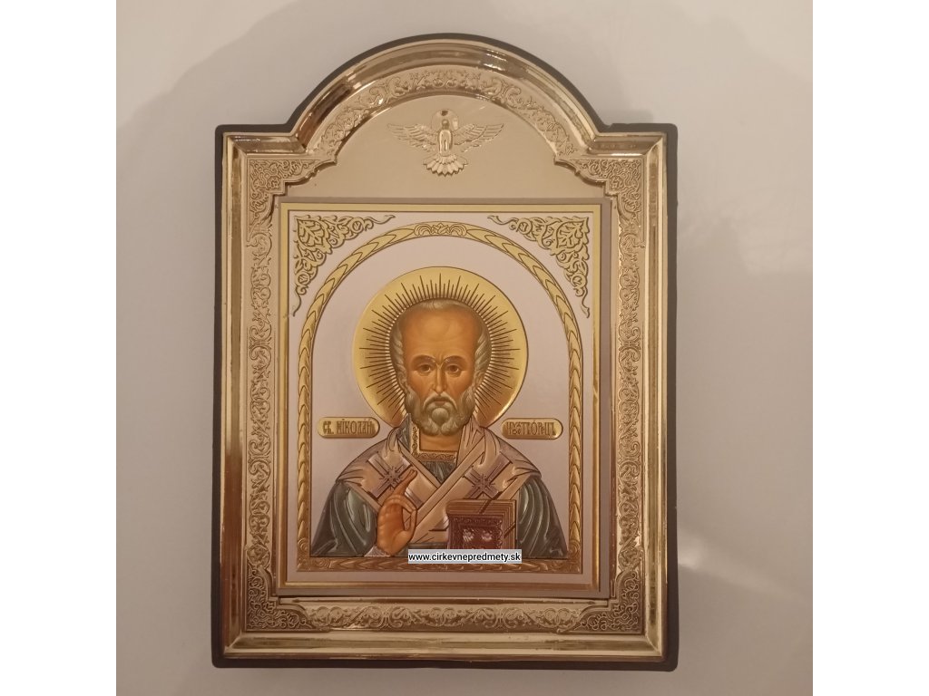 - Zobrazuje sa ako biskup s mitrou a berlou. Často drží tri zlaté gule alebo mešce, symbolizujúce jeho darovanie vena chudobným dievčatám.