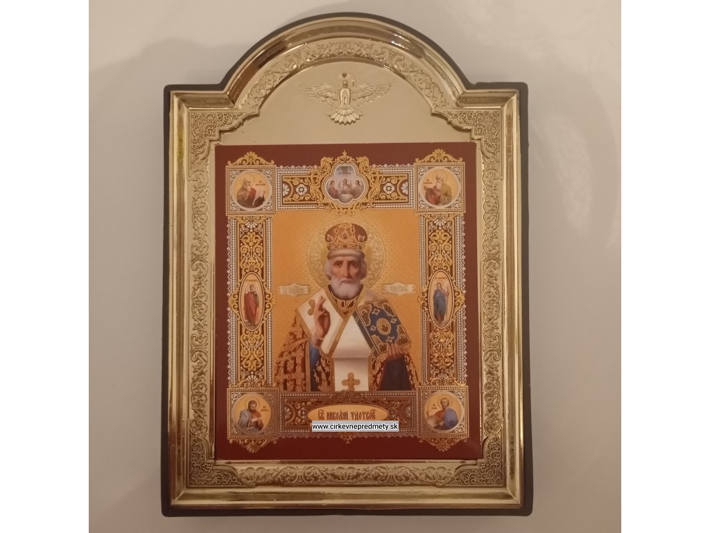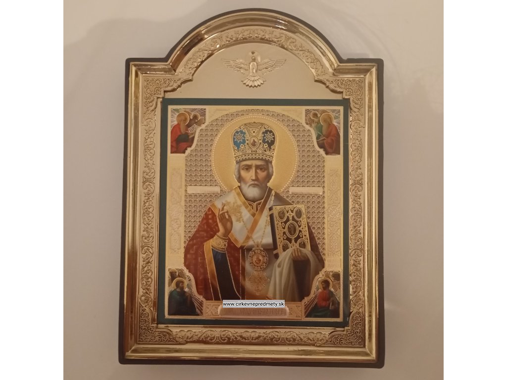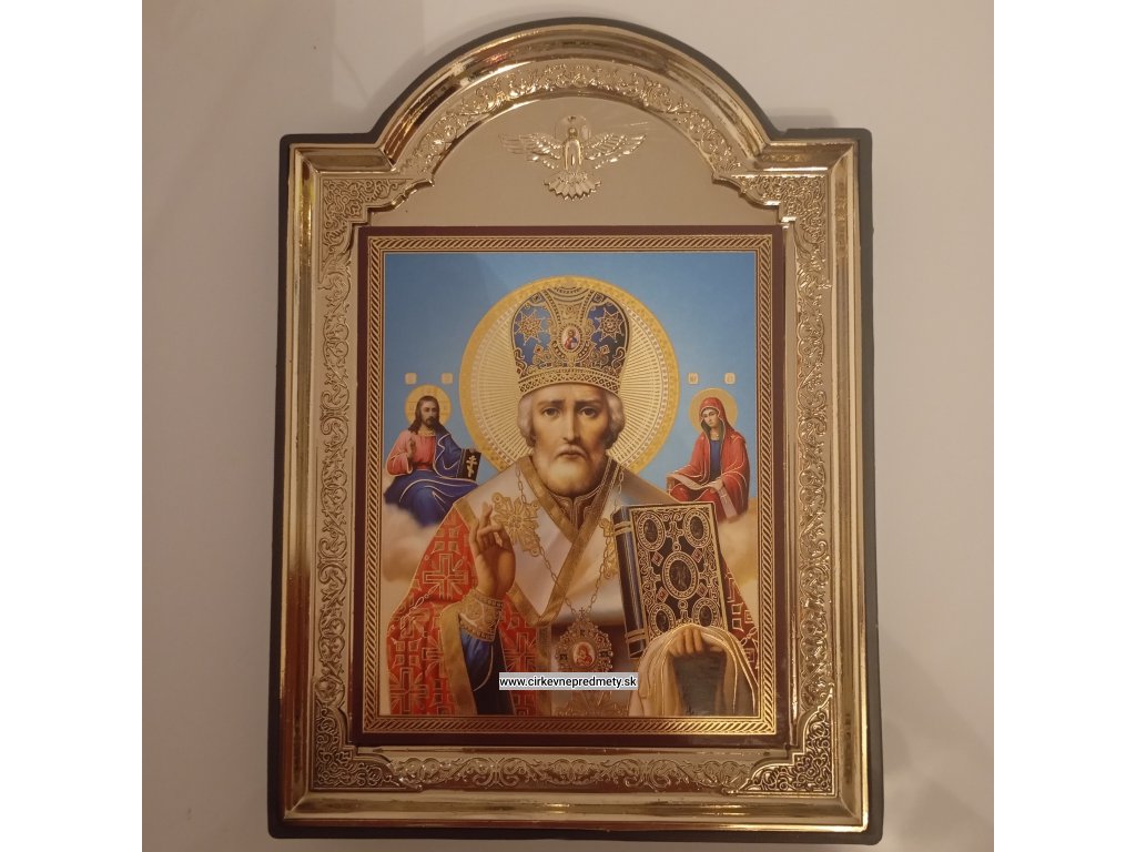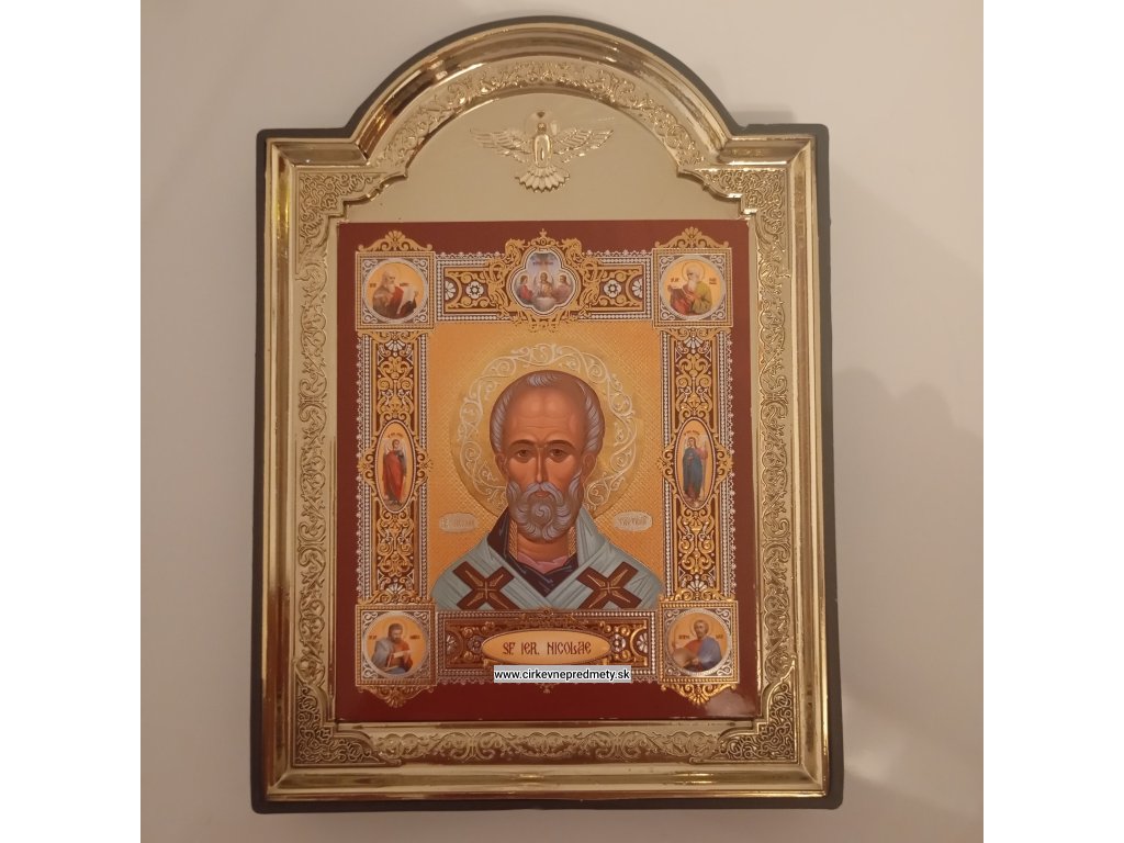 - Zobrazuje sa ako biskup s mitrou a berlou. Často drží tri zlaté gule alebo mešce, symbolizujúce jeho darovanie vena chudobným dievčatám.