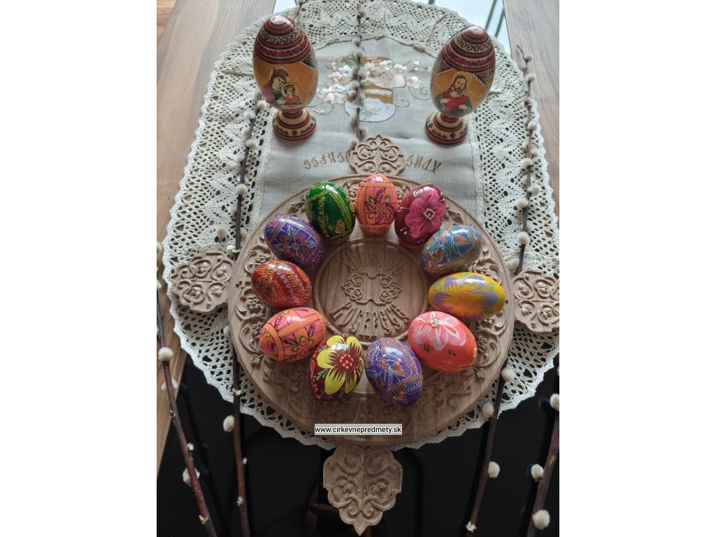 Veľkonočný tanier na kraslice vyrobený z masívneho dreva spája prirodzenú krásu materiálu s tradičnou symbolikou sviatku Veľká noc.
