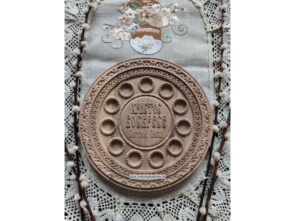 Veľkonočný tanier na kraslice vyrobený z masívneho dreva spája prirodzenú krásu materiálu s tradičnou symbolikou sviatku Veľká noc.