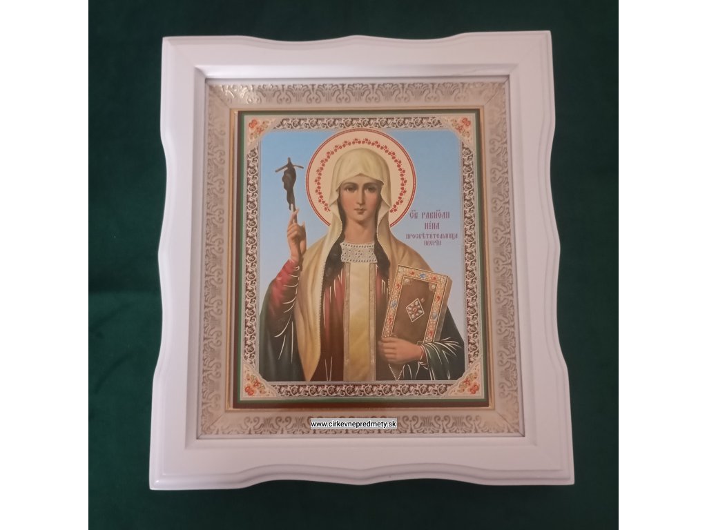 - Svätá Nina je zobrazená ako mladá žena v jednoduchom odeve, čo symbolizuje jej pokoru.